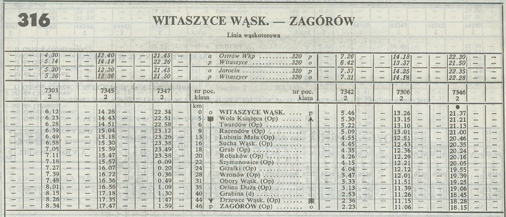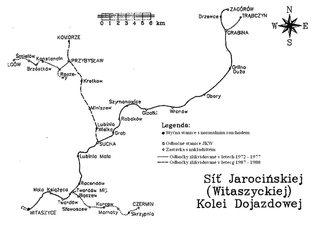 V průběhu 70. let také došlo k likvidaci stále méně využívaných odbočných tratí. V letech 1978-79 byly zrušeny tratě Przybysław – Lgów a Twardów – Czermin. Na krátké odbočce Grabina – Trąbczyn pravidelný provoz ustal již v roce 1972. V roce 1985 PKP zavedlo omezení doby nakládky vozů na vlečce GS v Zagórówě, což se opět negativně projevilo na množství přepravovaného zboží. V dubnu 1987 byla zahájena tříměsíční obnova viaduktu na Prośnie, což opět otevřelo debaty o zrušení celé železnice. V červenci téhož roku PKP zvýšila ceny za obsluhu vlečky GS Zagórów, což nakonec majitele přimnělo k její likvidaci. V září se ze stejného důvodu . neúměrně vysoké finanční nároky – GS vzdala pronájmu nákladiště ve stanici Zagórów. Železnice tak přišla o posledního zásadního zákazníka. V roce 1987 pak byla uzavřena a zlikvidována odbočka Sucha – Komorze, původní hlavní trať zdejší sítě.